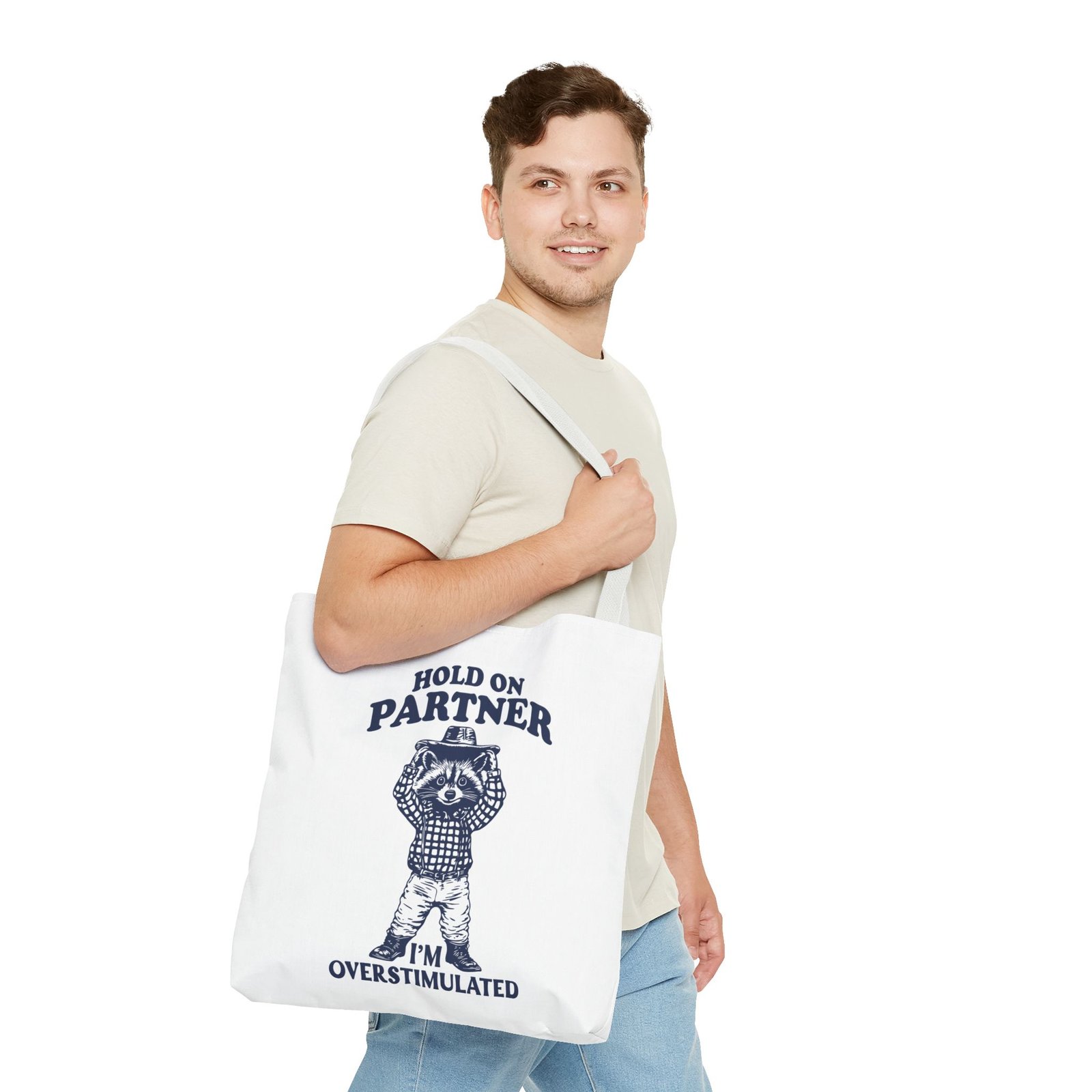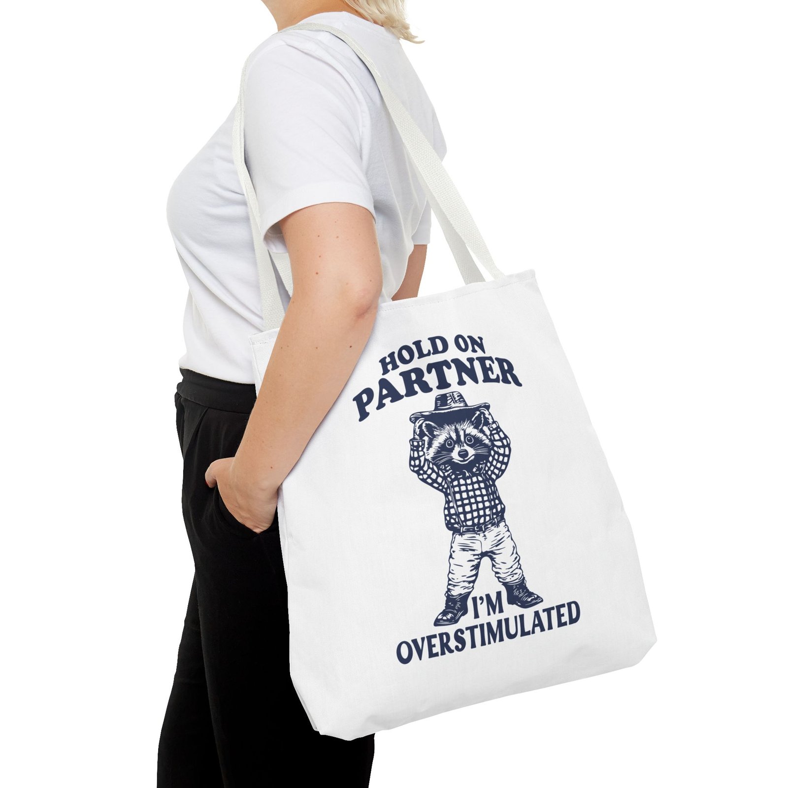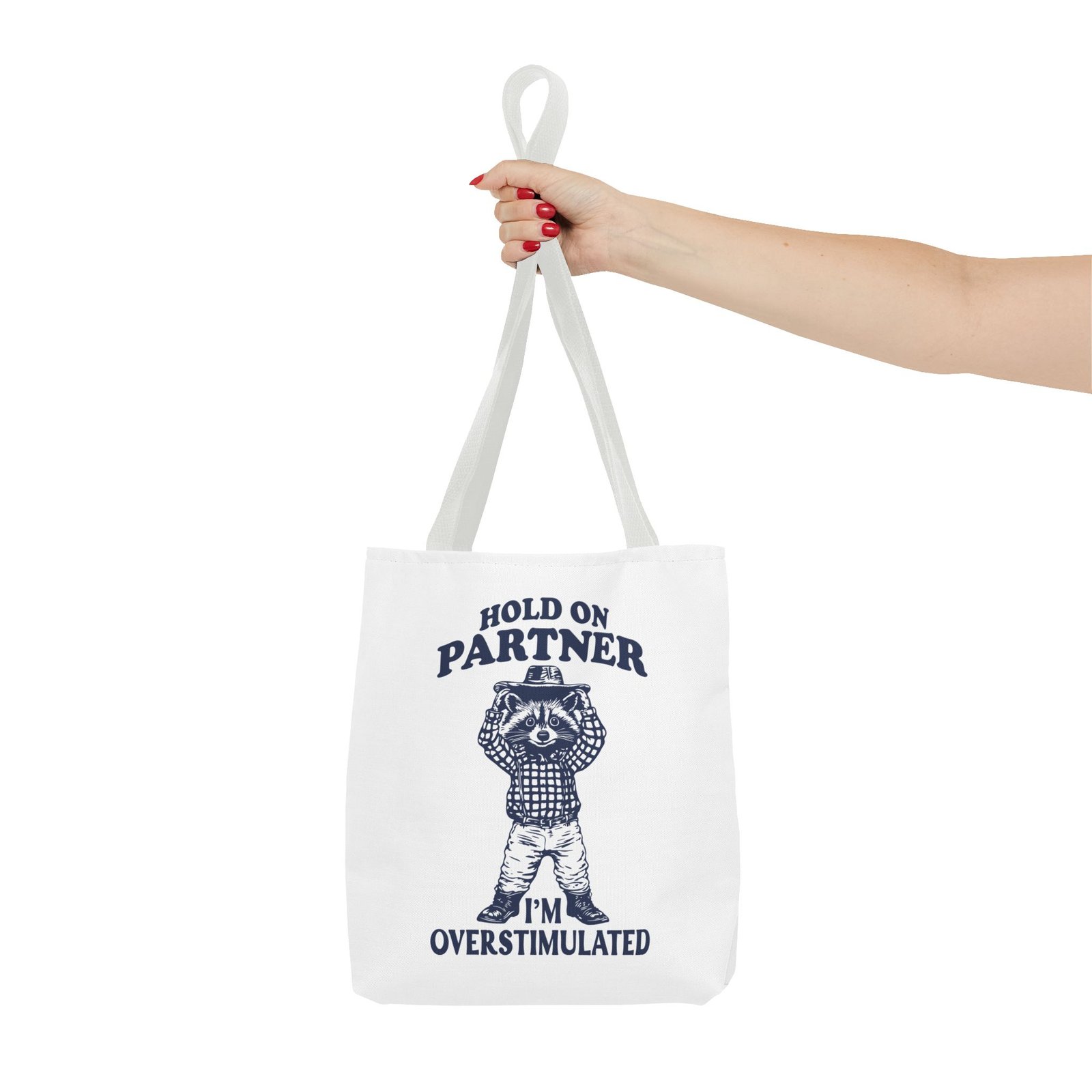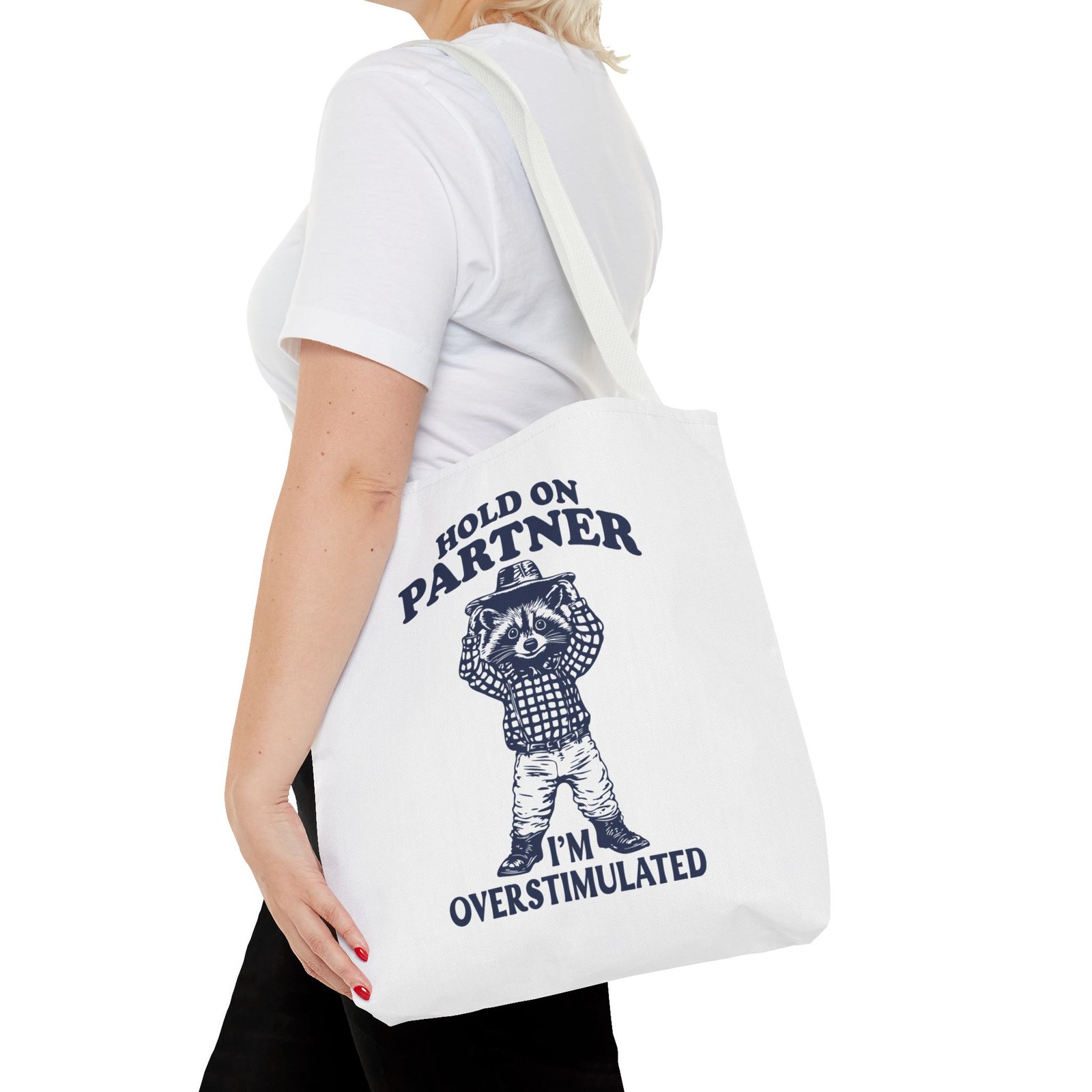 Hold On Partner Funny Raccoon Cartoon Graphic- Tote Bag